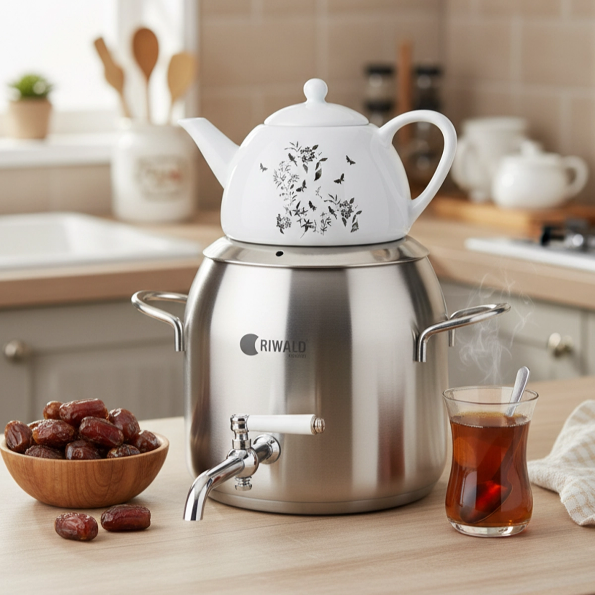سماور روگازی لیورپول ریوالد 6818155-1020 یک سرویس کتری و قوری از برند مشهور و باکیفیت ریوالد (Riwald) است که با ترکیب جنس استیل و چینی، طراحی مدرن و کاربردی را با دوام بالا تلفیق کرده تا تجربه بهتری از آماده‌سازی چای را فراهم آورد. کتری این محصول از استیل ضد زنگ با کیفیت بالا از آلیاژ ۱۸/۱۰ کروم-نیکل ساخته شده که در برابر زنگ‌زدگی و خوردگی بسیار مقاوم است و ظرفیت آن ۴.۸ لیتر می‌باشد. قوری آن نیز از جنس چینی مرغوب با ظرفیت ۱ لیتر است که طعم و عطر چای را به خوبی حفظ می‌کند و یکی از ویژگی‌های منحصر به فرد آن، مقاومت در برابر حرارت مستقیم است؛ به طوری که می‌توان آن را به صورت جداگانه و بدون نگرانی از شکستن، مستقیماً روی شعله گاز قرار داد.