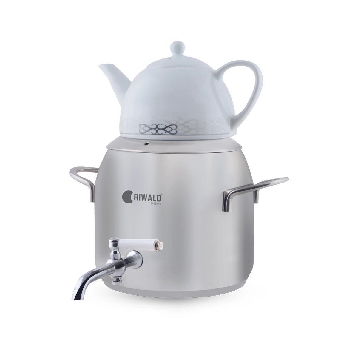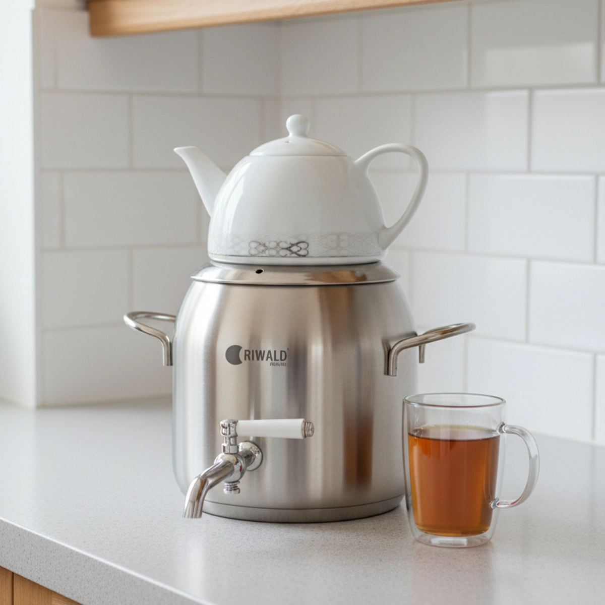 سماور روگازی لیورپول ریوالد 6818165-1020 یک سرویس کتری و قوری از برند مشهور و باکیفیت ریوالد (Riwald) است که با ترکیب جنس استیل و چینی، طراحی مدرن و کاربردی را با دوام بالا تلفیق کرده تا تجربه بهتری از آماده‌سازی چای را فراهم آورد. کتری این محصول از استیل ضد زنگ با کیفیت بالا از آلیاژ ۱۸/۱۰ کروم-نیکل ساخته شده که در برابر زنگ‌زدگی و خوردگی بسیار مقاوم است و ظرفیت آن ۴.۸ لیتر می‌باشد. قوری آن نیز از جنس چینی مرغوب با ظرفیت ۱ لیتر است که طعم و عطر چای را به خوبی حفظ می‌کند و یکی از ویژگی‌های منحصر به فرد آن، مقاومت در برابر حرارت مستقیم است؛ به طوری که می‌توان آن را به صورت جداگانه و بدون نگرانی از شکستن، مستقیماً روی شعله گاز قرار داد.
