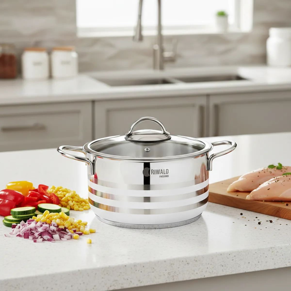 قابلمه استیل لیورپول ریوالد 6803220-1022 با بهره‌گیری از مرغوب‌ترین آلیاژ استیل ضدزنگ 18/10 (ترکیب ایده‌آل کروم و نیکل)، استاندارد جدیدی از دوام و سلامت را در آشپزخانه شما تعریف می‌کند. کفه ۳ لایه حرفه‌ای این محصول با تکنولوژی پیشرفته تولید شده است تا با توزیع کاملاً یکنواخت و سریع حرارت در تمام سطح قابلمه، از ایجاد نقاط داغ و سوختن موضعی غذا جلوگیری کرده و فرآیند پخت‌وپز را بهینه‌تر و سریع‌تر از همیشه پیش ببرد.